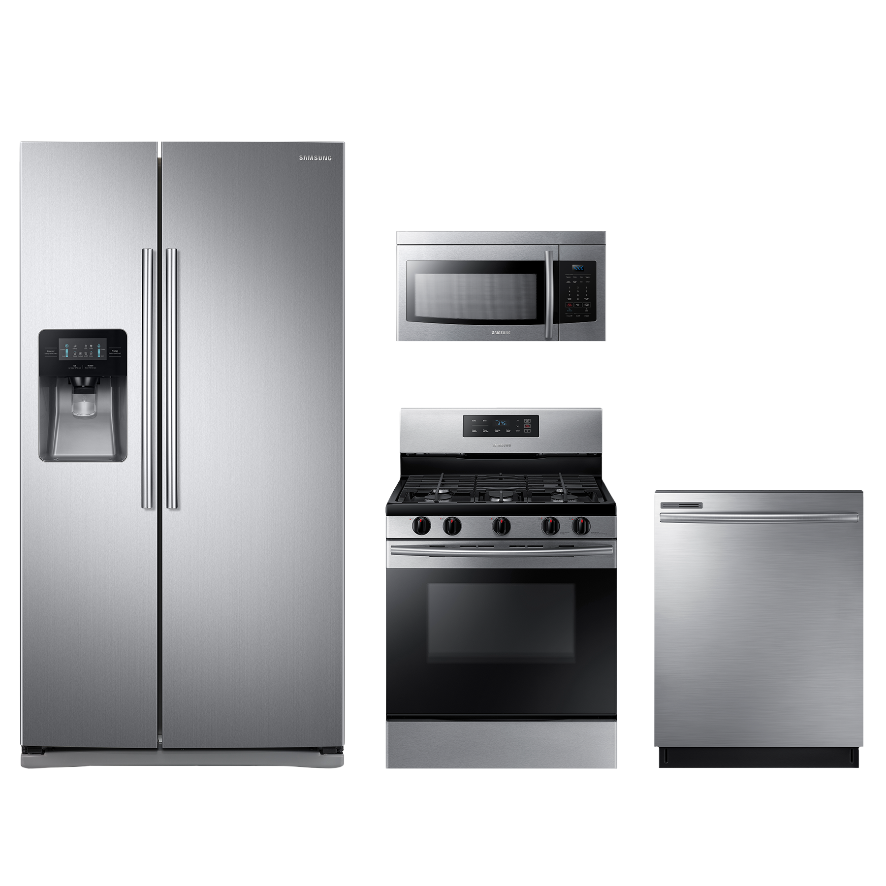 Samsung 4 Piece Kitchen Package-Stainless Steel with a side-by-side refrigerator, freestanding gas range, top control dishwasher and over the range microwaveRead More